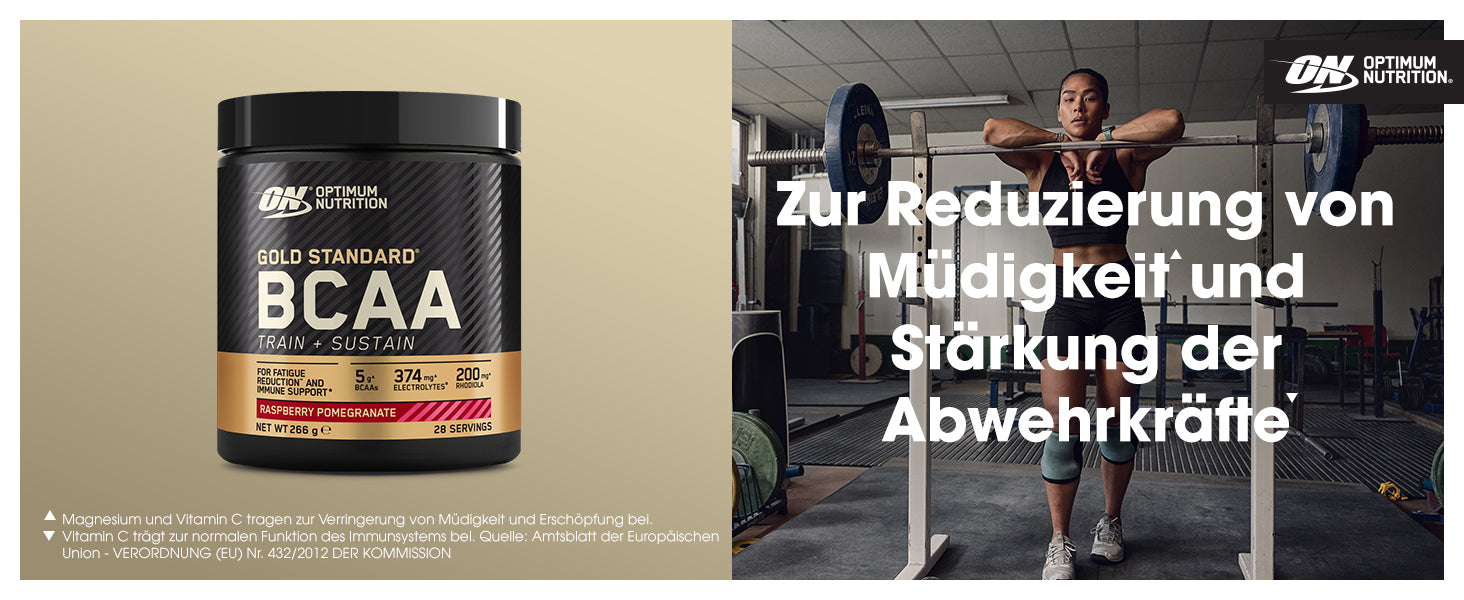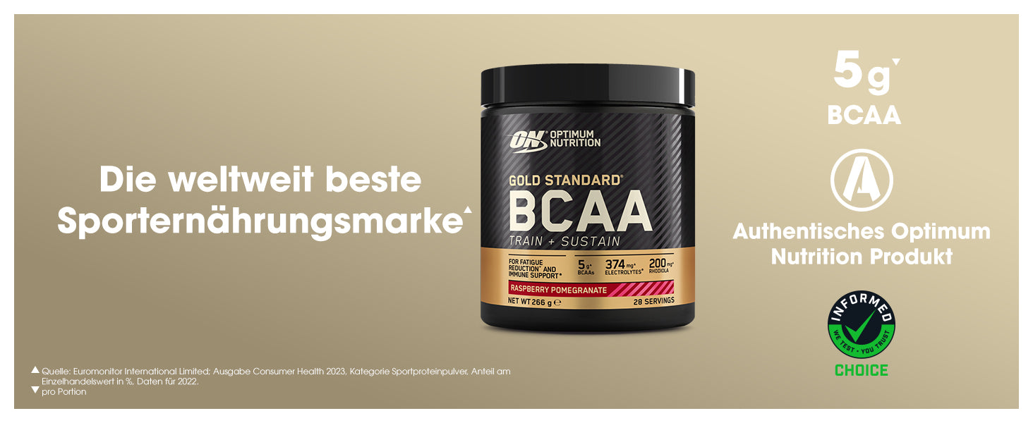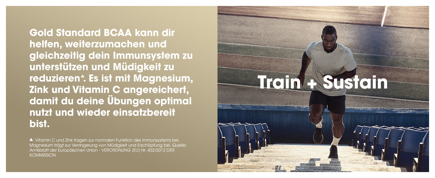 BCAAs (Branched-Chain Amino Acids, verzweigtkettige Aminosäuren) sind eine Gruppe drei essenzieller Aminosäuren - Leucin, Isoleucin und Valin -, die als wichtige Proteinbausteine gelten. Gold Standard BCAA Train + Sustain Powder liefert BCAAs sowie Vitamine und Elektrolyte, sodass es eine praktische und einfache Wahl ist, mit der die persönlichen Ernährungsbedürfnisse beim Sport unterstützt werden können.