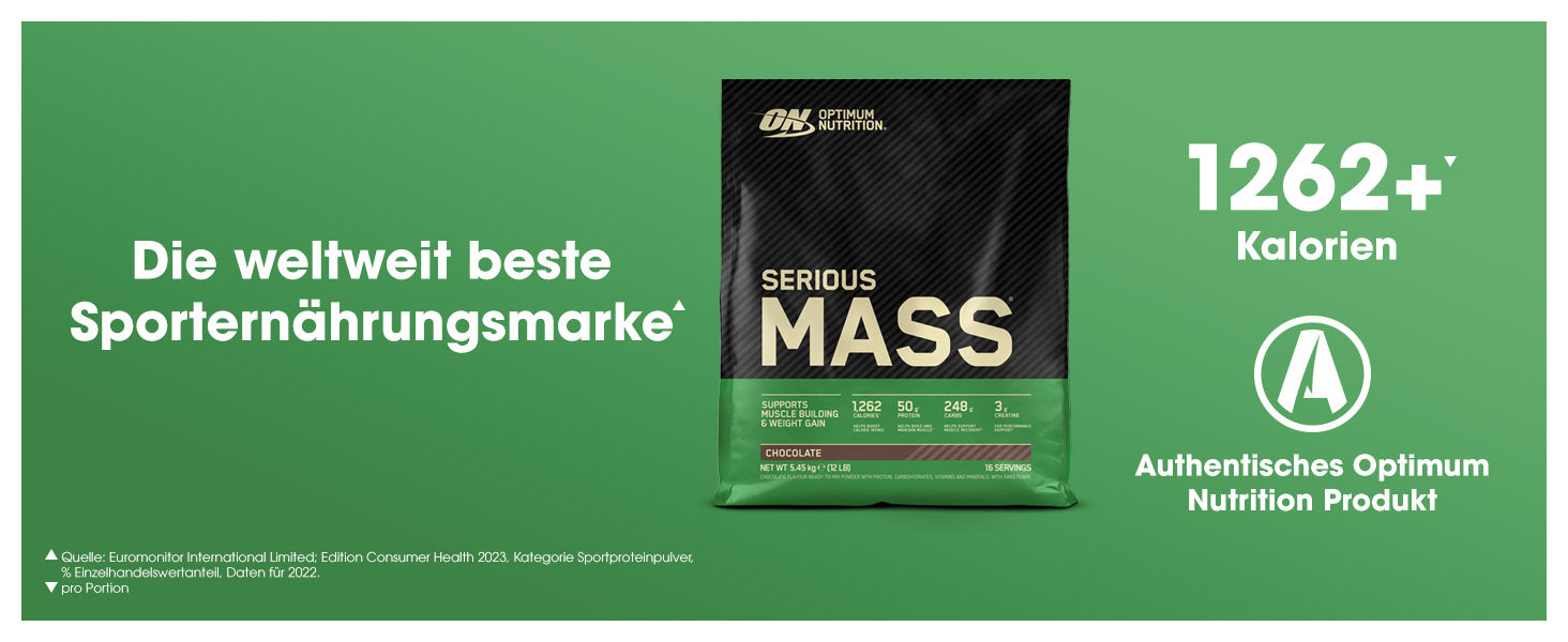 Serious Mass ist eine hochkalorische Rezeptur für die Gewichtszunahme und wurde entwickelt, um die tägliche Kalorienzufuhr zu erhöhen und so die Trainings- und Ernährungsziele zu unterstützen. Jede Portion enthält 1.250 Kalorien, 50 Gramm Protein, über 250 Gramm Kohlenhydrate und 3 Gramm zugesetztes Kreatin zur Leistungssteigerung.